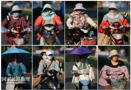 8月8日拍攝的杭州市區(qū)不同騎車者的防暑“裝備”(拼版照片)。