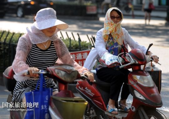 8月8日,杭州城區(qū)兩位“全副武裝”的騎車人在高溫下騎行。