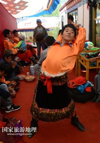 8月6日,在西藏堆龍德慶縣乃瓊鎮(zhèn)甲熱村,覺木隆藏戲團的演員們在村里的雪頓節(jié)慶典上表演。