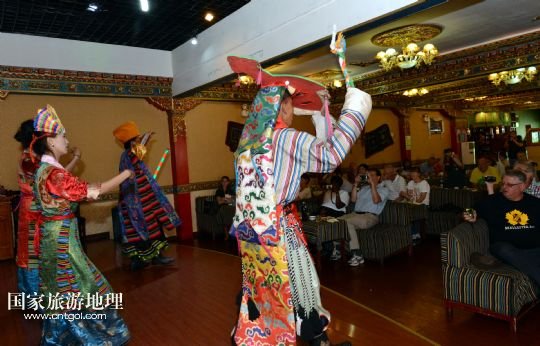 8月4日,在西藏拉薩,覺木隆藏戲團的演員們?yōu)橐患屹e館的客人演出。