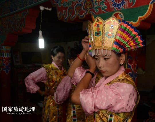 8月3日,在西藏堆龍德慶縣乃瓊鎮(zhèn),覺木隆藏戲團演員次珍在望果節(jié)演出前練習(xí)。