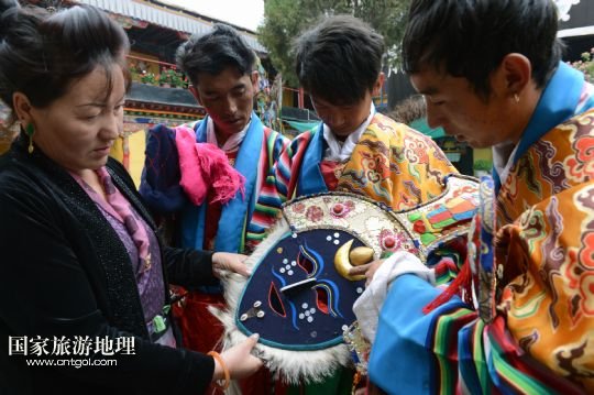 8月3日,在西藏堆龍德慶縣乃瓊鎮(zhèn),覺木隆藏戲團團長瓊達(中)和演員們準(zhǔn)備參加鄰近幾個村的望果節(jié)演出。