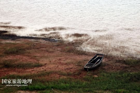 8月8日,一只小漁船擱淺在“瘦身”后裸露的鄱陽湖湖岸。