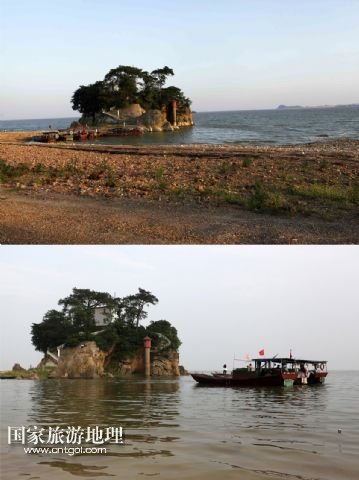 這張拼版照片顯示的是:8月8日,水位低落的鄱陽湖江西省都昌縣印山島水域(上圖);5月19日,漲水中的鄱陽湖江西省都昌縣印山島水域(下圖)。