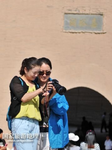 8月10日,兩名游客在嘉峪關(guān)城門前查看照片。