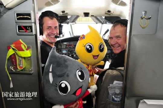 8月14日,百年靈噴氣機隊保障機飛行員呂克(左)和飛行隊負責人奈杰爾(右)在飛近克拉瑪依時,揮舞克拉瑪依航空旅游節(jié)吉祥物“克拉”和“瑪依”以示慶祝。