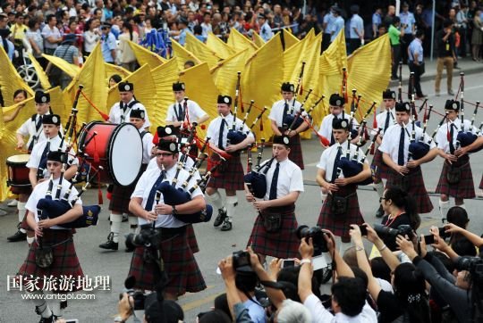9月30日,蘇格蘭風(fēng)笛樂團(tuán)在廣西柳州市駕鶴路巡游。
