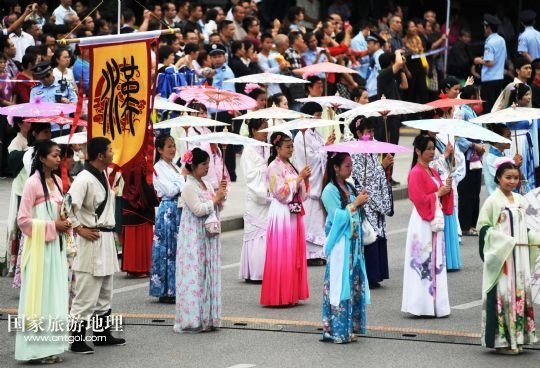 9月30日,巡游隊(duì)伍在廣西柳州市駕鶴路上展示漢服。