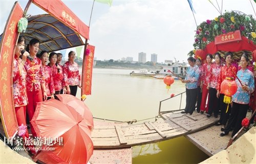 國家旅游地理 廣西南寧10月3日訊(記者 龍博 實(shí)習(xí)生 雷麗軍/文 記者 段柳健/圖) 金秋十月的邕江河畔,秋高氣爽,碧水粼粼。昨日,從南寧港的江邊傳來陣陣漁歌與歡喜的嗩吶聲,原來,水上人家周木蘭家在這一天嫁女,一場(chǎng)古樸而傳統(tǒng)的水上婚禮儀式正在邕江岸邊拉開序幕。隨著水上人家的上岸,這樣的傳統(tǒng)婚俗儀式越來越少見,而獨(dú)特且略顯神秘的婚俗也吸引了四面八方過來湊熱鬧的人們。