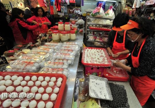 12月22日,臺(tái)北市南門市場(chǎng)的攤主手工包湯圓,供顧客選購(gòu)。