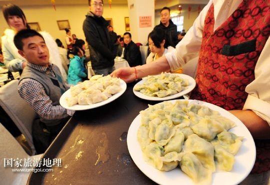 12月22日,寧夏銀川一家餃子館的服務(wù)員給顧客上餃子。