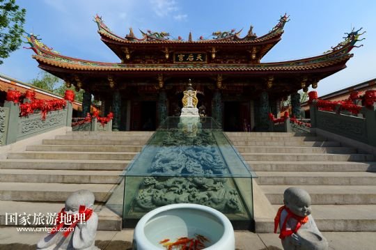 這是臺兒莊古城在原址復(fù)建的媽祖廟(4月7日攝)。作為京杭運河上重要的水旱碼頭之一,臺兒莊的建筑融合了多種文化元素。