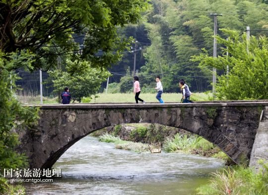 5月11日,幾名小孩從土目源村的石橋上走過。