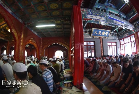7月18日,穆斯林群眾在北京牛街禮拜寺參加開齋節(jié)聚禮。新華社記者羅曉光攝