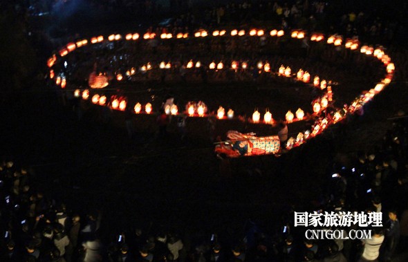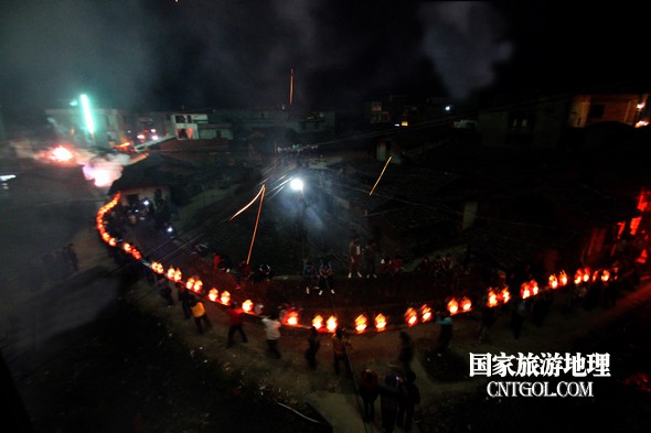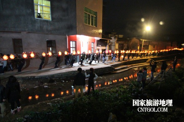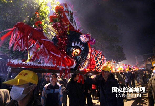 2月18日入夜,春雨霏霏。在光裕堂祖祠祭龍頭畢,鄒姓村民紛紛肩抬慶燈到祖祠接成220多米長的“龍”身。三聲銃響,游龍時而在村間慢悠游弋,時而在村道滯拔狂走,火紅的燭光伴著霏霏春雨,讓慶燈“龍”絢麗多姿,展示了“紙包火”的奇跡。 游“龍”所經之處,鞭炮和禮花聲不絕于耳,祈求五谷豐登、吉祥如意。街巷人山人海,熱鬧非凡,一派花燈游龍慶豐收狂歡鬧元宵盛況。 吸引了海內外游客及四鄰八鄉(xiāng)的萬余群眾紛紛前往觀看。